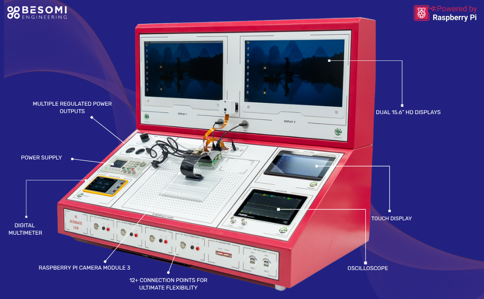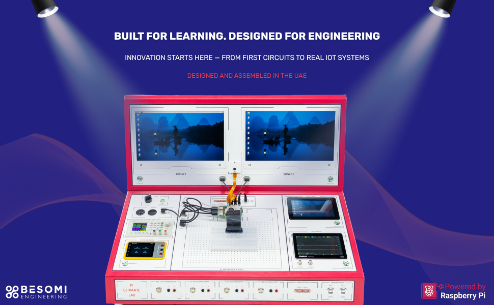 Built around the powerful Raspberry Pi platform, this fully integrated bench combines dual displays, professional test equipment, structured power management, and modular connectivity — giving students, makers, and engineers everything they need to design, build, and test projects in one organized environment.